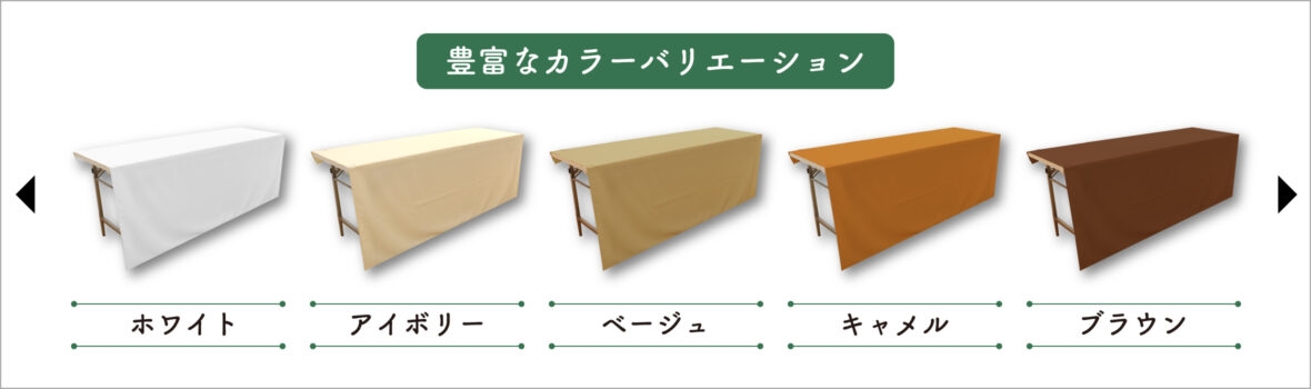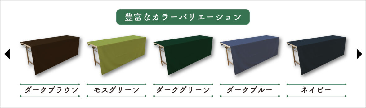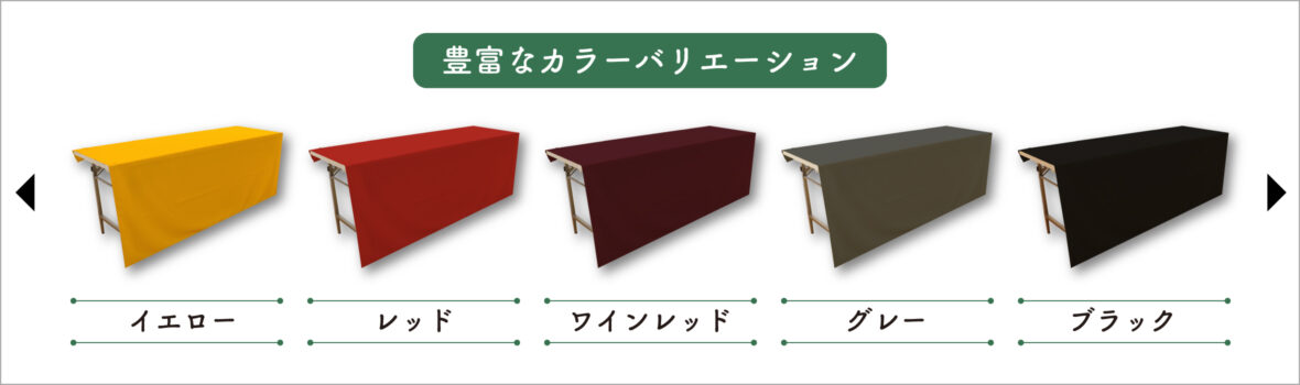 展示会、イベント等で使われる折りたたみテーブル(奥行き60cm、45cm)向けに10サイズ、色は各14色の在庫をご用意しております。お急ぎの方におすすめです。